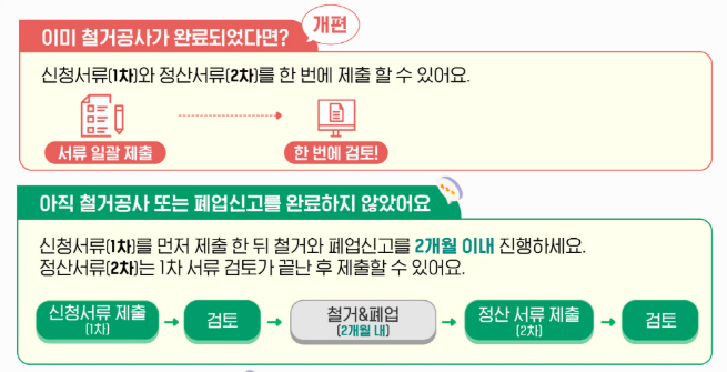 이제는 폐업신고 + 철거 완료 후 1, 2차 서류를 한 번에 제출하면 지원받을 수 있어요.